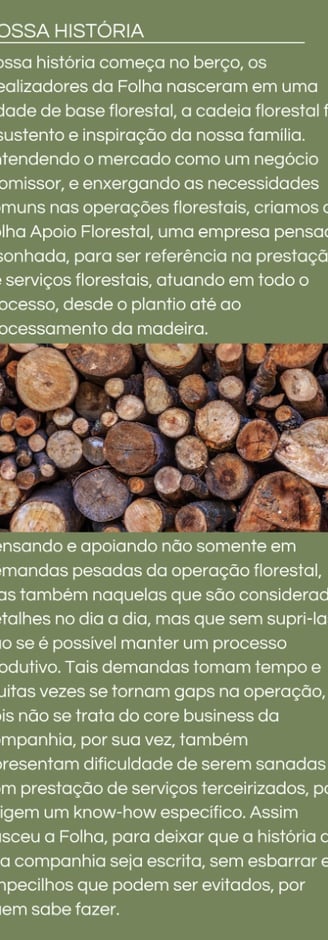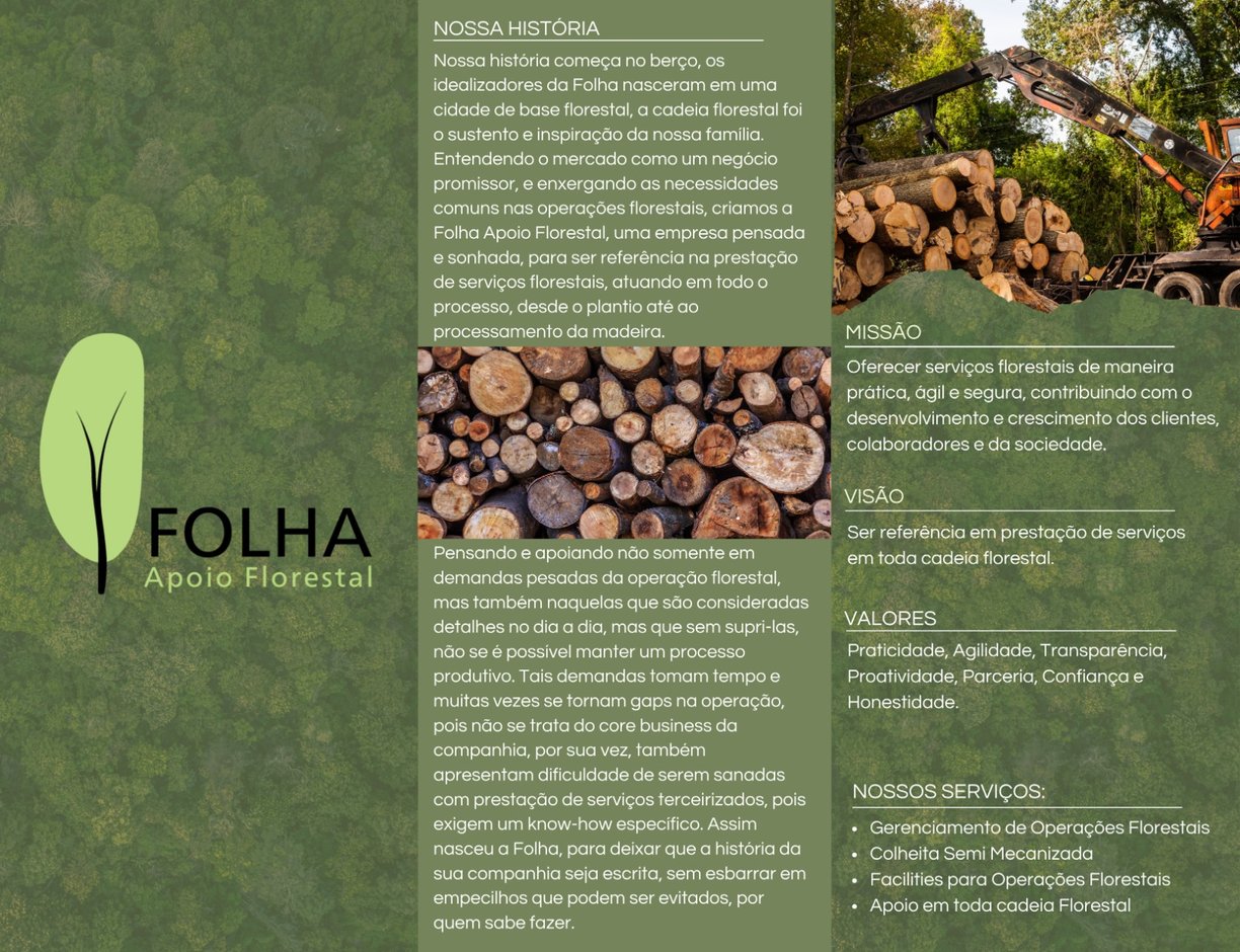 Especializada em corte de madeira, gerenciamento de operação florestal e colheita semi mecanizada. Providing facilities para operação florestal.